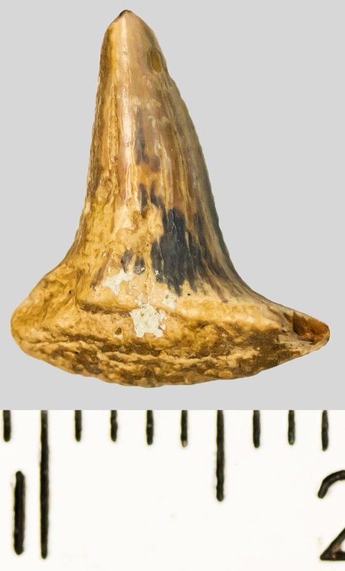 Главная вершина коронки средних размеров зуба серо-охристого цвета, колющего типа, с гладким режущим краем, окатанная. Эмаль коронки с обеих сторон у основания несет следы скульптуры в виде грубой струйчатости. Корень не сохранился.