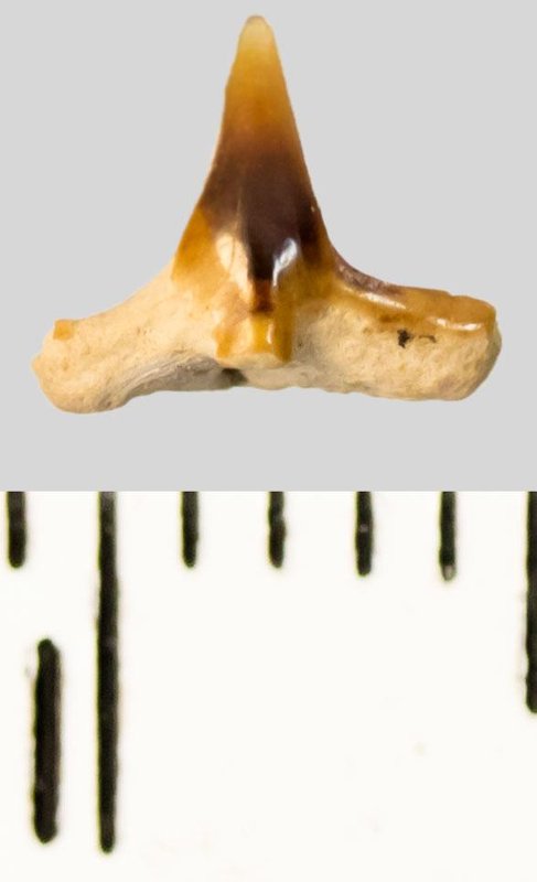 Мелкий зуб с коронкой буро-охристого цвета, колющего типа. Главная вершина округлая в сечении, с гладким режущим краем, от нее справа и слева вдоль корня отходят два киля, не образующие добавочных зубцов. Эмаль коронки не скульптирована. Корень уплощенный, ромбовидный, почти перпендикулярный коронке, сливочного цвета, с питательным отверстием с вентральной стороны, заметно окатанный.