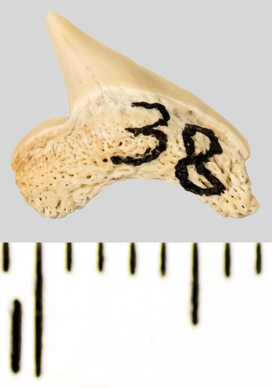 Мелкий боковой зуб с коронкой белого цвета, режущего типа, сильно скошенной, без скульптуры, с гладким режущим краем. Корень грязно-белого цвета, арочный, умеренно массивный, со следами заметной окатанности. Добавочные зубцы коронки редуцированы до округлых килей.