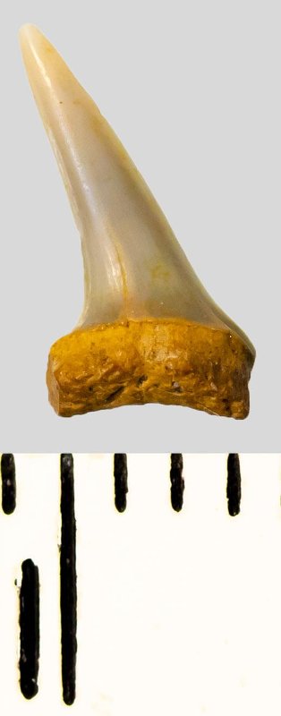 Коронка мелкого зуба серого цвета, режущего типа, S-образно изогнутая, с гладким режущим краем. Корень темно-охристый, сильно окатанный, сохранился фрагментарно.