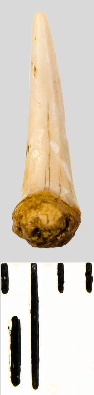 Коронка мелкого зуба светло-кремового цвета, колюще-режущего типа, S-образно изогнутая, с гладким режущим краем. Корень темный, серо-охристый, сильно окатанный, сохранился фрагментарно.