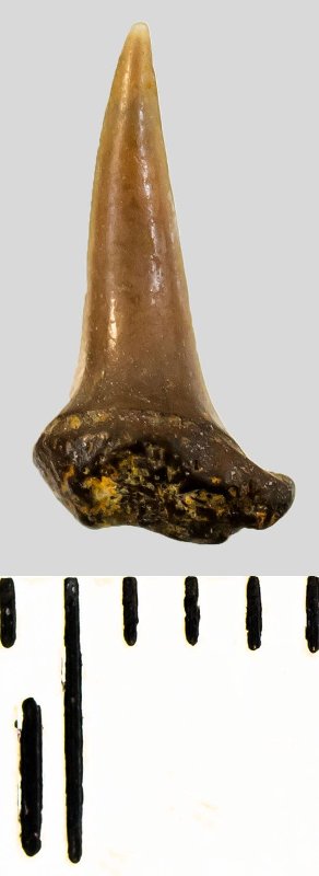 Коронка мелкого зуба темно-коричневого цвета, колюще-режущего типа, S-образно изогнутая, с гладким режущим краем. Корень бурый, сильно окатанный, сохранился фрагментарно.