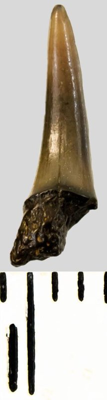 Коронка мелкого зуба темно-оливкового цвета, колюще-режущего типа, S-образно изогнутая, с гладким режущим краем. С лингвальной стороны у основания коронки на эмали имеется скульптура в виде слабой продольной струйчатости. Корень черный, сильно окатанный, сохранился фрагментарно.