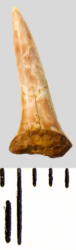 Коронка мелкого зуба розовато-кремового цвета с белесыми пятнами, колюще-режущего типа, S-образно изогнутая, с гладким режущим краем. Корень красновато-охристый, сильно окатанный, сохранился фрагментарно.