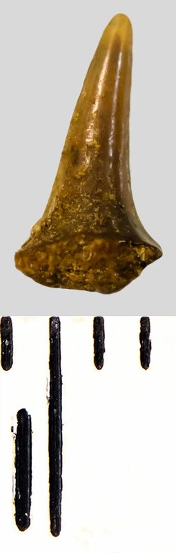 Коронка мелкого зуба темно-охристого цвета, режущего типа, S-образно изогнутая, с гладким режущим краем. Корень темно-охристый, сильно окатанный, сохранился фрагментарно.