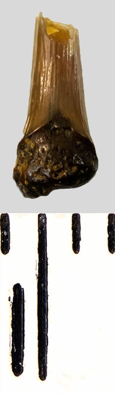 Коронка мелкого зуба темно-охристого цвета, колюще-режущего типа, S-образно изогнутая, с гладким режущим краем. С лингвальной стороны у основания коронки на эмали имеется скульптура в виде слабой продольной струйчатости. Корень бурый, сильно окатанный, сохранился фрагментарно.