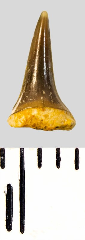 Коронка мелкого зуба бурого цвета, режущего типа, S-образно изогнутая, с гладким режущим краем. Корень охристый, сильно окатанный, сохранился фрагментарно.
