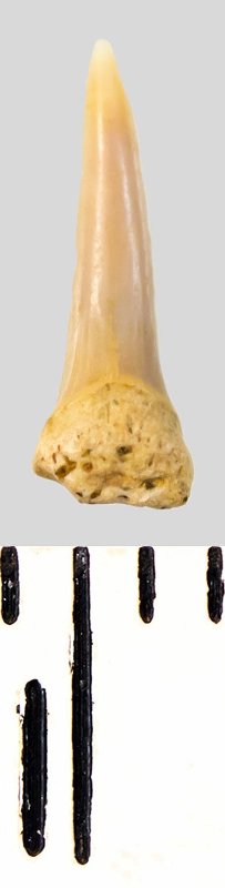 Коронка мелкого зуба светло-бежевого цвета, колюще-режущего типа, S-образно изогнутая, с гладким режущим краем. Корень светло-охристый, сильно окатанный, сохранился фрагментарно.
