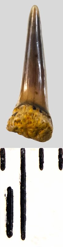 Коронка мелкого зуба бурого цвета, колюще-режущего типа, S-образно изогнутая, с гладким режущим краем. Корень темно-охристый, сильно окатанный, сохранился фрагментарно.