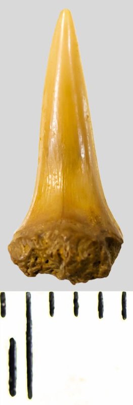 Зуб (фрагмент). Акула. Eostriatolamia subulata (Agassiz, 1843). Классификация: Хордовые Chordata, Позвоночные Vertebrata, Хрящевые рыбы Chondrichthyes, Пластиножаберные Elasmobranchii, Акулы Selachii, Ламнообразные Lamniformes, Песчаные акулы Odontaspididae