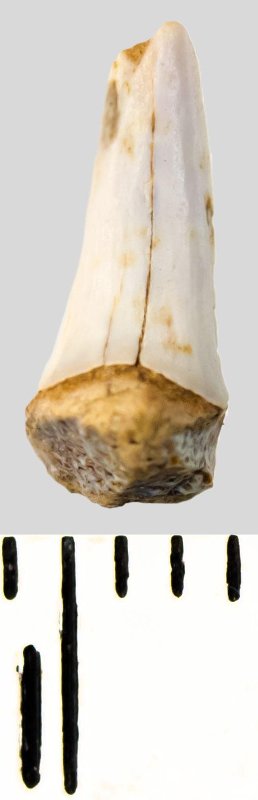 Коронка мелкого зуба светло-серого цвета, колюще-режущего типа, S-образно изогнутая, с гладким режущим краем. Корень серо-охристый, сильно окатанный, сохранился фрагментарно.
