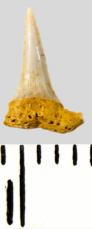 Зуб (фрагмент). Акула. Eostriatolamia subulata (Agassiz, 1843). Классификация: Хордовые Chordata, Позвоночные Vertebrata, Хрящевые рыбы Chondrichthyes, Пластиножаберные Elasmobranchii, Акулы Selachii, Ламнообразные Lamniformes, Песчаные акулы Odontaspididae