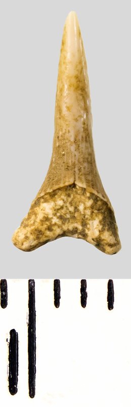 Зуб (фрагмент). Акула. Eostriatolamia subulata (Agassiz, 1843). Классификация: Хордовые Chordata, Позвоночные Vertebrata, Хрящевые рыбы Chondrichthyes, Пластиножаберные Elasmobranchii, Акулы Selachii, Ламнообразные Lamniformes, Песчаные акулы Odontaspididae