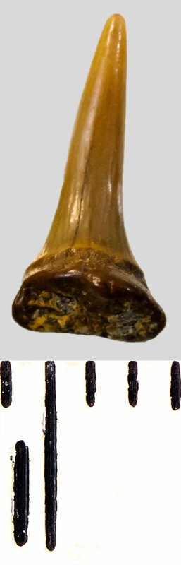 Зуб (фрагмент). Акула. Eostriatolamia subulata (Agassiz, 1843). Классификация: Хордовые Chordata, Позвоночные Vertebrata, Хрящевые рыбы Chondrichthyes, Пластиножаберные Elasmobranchii, Акулы Selachii, Ламнообразные Lamniformes, Песчаные акулы Odontaspididae