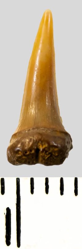 Зуб (фрагмент). Акула. Eostriatolamia subulata (Agassiz, 1843). Классификация: Хордовые Chordata, Позвоночные Vertebrata, Хрящевые рыбы Chondrichthyes, Пластиножаберные Elasmobranchii, Акулы Selachii, Ламнообразные Lamniformes, Песчаные акулы Odontaspididae