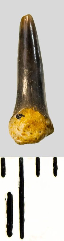 Коронка мелкого зуба бурого, почти черного цвета, колюще-режущего типа, S-образно изогнутая, с гладким режущим краем. С лингвальной стороны у основания коронки на эмали имеется скульптура в виде слабой продольной струйчатости. Корень охристый, сильно окатанный, сохранился фрагментарно.
