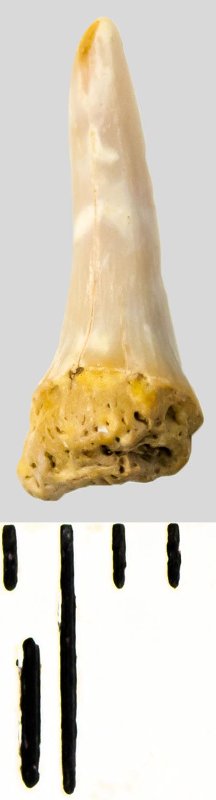 Коронка мелкого зуба светло-серого цвета с белесыми вкраплениями, колюще-режущего типа, S-образно изогнутая, с гладким режущим краем. С лингвальной стороны у основания коронки на эмали имеется скульптура в виде слабой продольной струйчатости. Корень светло-охристый, сильно окатанный, сохранился фрагментарно.