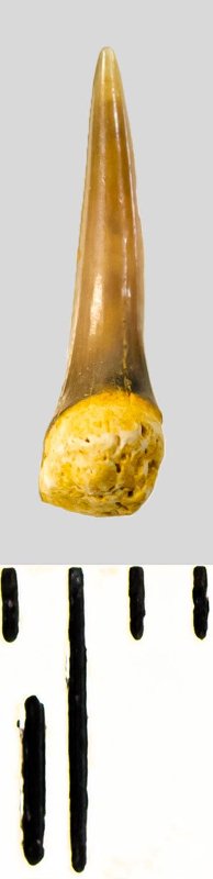 Коронка мелкого зуба темно-охристого цвета, колюще-режущего типа, S-образно изогнутая, с гладким режущим краем. Корень светло-охристый, сильно окатанный, сохранился фрагментарно.