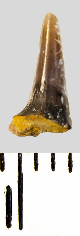 Зуб (фрагмент). Акула. Eostriatolamia subulata (Agassiz, 1843). Классификация: Хордовые Chordata, Позвоночные Vertebrata, Хрящевые рыбы Chondrichthyes, Пластиножаберные Elasmobranchii, Акулы Selachii, Ламнообразные Lamniformes, Песчаные акулы Odontaspididae