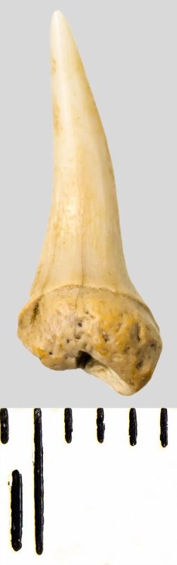 Зуб (фрагмент). Акула. Eostriatolamia subulata (Agassiz, 1843). Классификация: Хордовые Chordata, Позвоночные Vertebrata, Хрящевые рыбы Chondrichthyes, Пластиножаберные Elasmobranchii, Акулы Selachii, Ламнообразные Lamniformes, Песчаные акулы Odontaspididae