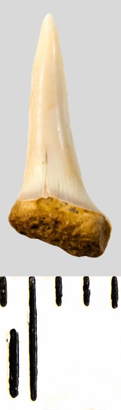 Зуб (фрагмент). Акула. Eostriatolamia subulata (Agassiz, 1843). Классификация: Хордовые Chordata, Позвоночные Vertebrata, Хрящевые рыбы Chondrichthyes, Пластиножаберные Elasmobranchii, Акулы Selachii, Ламнообразные Lamniformes, Песчаные акулы Odontaspididae