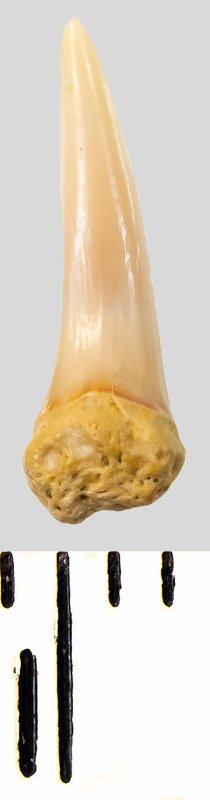 Коронка мелкого зуба светло-кремового цвета, колюще-режущего типа, S-образно изогнутая, с гладким режущим краем. С лингвальной стороны у основания коронки на эмали имеется скульптура в виде слабой продольной струйчатости. Корень светло-кремового цвета, сильно окатанный, сохранился фрагментарно.