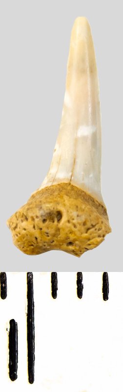 Зуб (фрагмент). Акула. Eostriatolamia subulata (Agassiz, 1843). Классификация: Хордовые Chordata, Позвоночные Vertebrata, Хрящевые рыбы Chondrichthyes, Пластиножаберные Elasmobranchii, Акулы Selachii, Ламнообразные Lamniformes, Песчаные акулы Odontaspididae