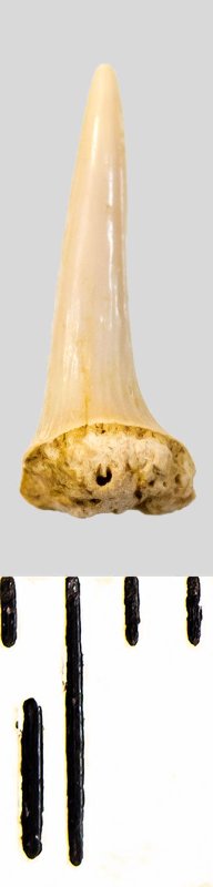 Зуб (фрагмент). Акула. Eostriatolamia subulata (Agassiz, 1843). Классификация: Хордовые Chordata, Позвоночные Vertebrata, Хрящевые рыбы Chondrichthyes, Пластиножаберные Elasmobranchii, Акулы Selachii, Ламнообразные Lamniformes, Песчаные акулы Odontaspididae