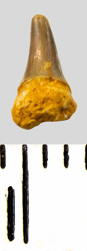 Зуб (фрагмент). Акула. Eostriatolamia subulata (Agassiz, 1843). Классификация: Хордовые Chordata, Позвоночные Vertebrata, Хрящевые рыбы Chondrichthyes, Пластиножаберные Elasmobranchii, Акулы Selachii, Ламнообразные Lamniformes, Песчаные акулы Odontaspididae