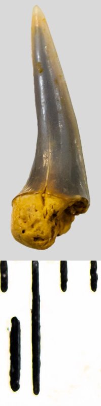 Коронка мелкого зуба темно-серого цвета, колюще-режущего типа, S-образно изогнутая, с гладким режущим краем. Корень темно-охристый, сильно окатанный, сохранился фрагментарно.