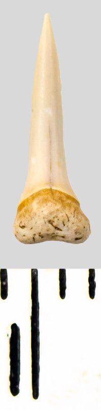 Коронка мелкого зуба сливочного, почти белого цвета, колюще-режущего типа, S-образно изогнутая, с гладким режущим краем. Корень светло-кремового цвета, сильно окатанный, сохранился фрагментарно.