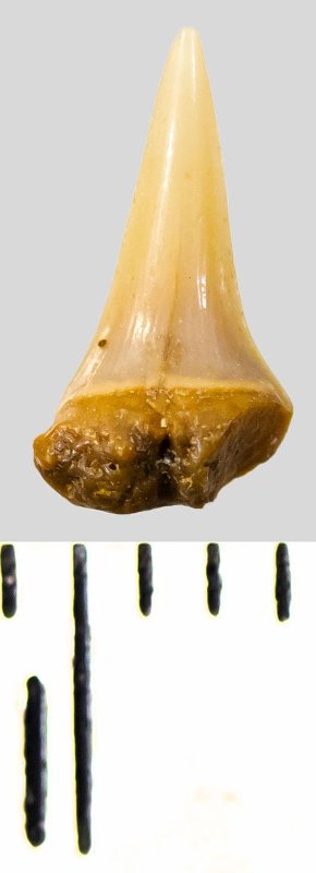 Коронка мелкого зуба кремового цвета, режущего типа, S-образно изогнутая, с гладким режущим краем. Корень темно-охристый, сильно окатанный, сохранился фрагментарно.