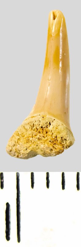 Коронка мелкого зуба кремово-охристого цвета, колюще-режущего типа, S-образно изогнутая, с гладким режущим краем. Корень охристый, сильно окатанный, сохранился фрагментарно.