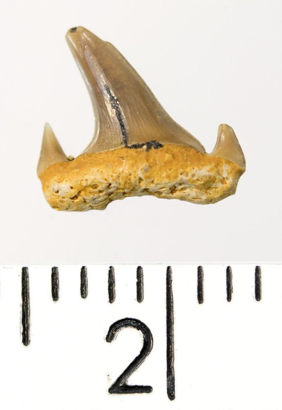 Мелкий боковой зуб с коронкой серого цвета, колюще-режущего типа, S-образно изогнутой, с гладким режущим краем. С лингвальной стороны у основания коронки на эмали имеется скульптура в виде слабой продольной струйчатости. Корень охристый, арочный, умеренно массивный, со следами окатанности. Имеются питательная борозда с лингвальной стороны корня и одна пара добавочных зубцов коронки.