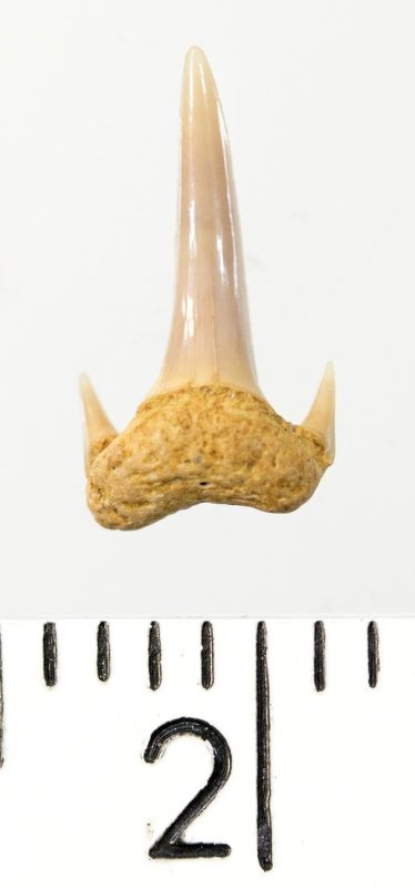Мелкий боковой зуб с коронкой серого цвета, колюще-режущего типа, S-образно изогнутой, с гладким режущим краем. С лингвальной стороны у основания коронки на эмали имеется скульптура в виде слабой продольной струйчатости. Корень охристый, арочный, умеренно массивный, со следами окатанности. Имеются питательная борозда с лингвальной стороны корня и одна пара добавочных зубцов коронки.