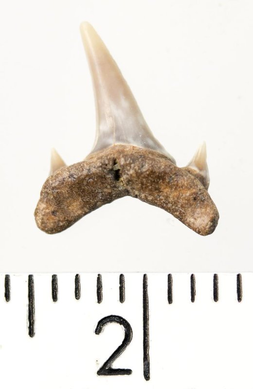 Мелкий боковой зуб с коронкой серого цвета, колюще-режущего типа, S-образно изогнутой, с гладким режущим краем. С лингвальной стороны у основания коронки на эмали имеется скульптура в виде слабой продольной струйчатости. Корень охристый, арочный, умеренно массивный, со следами окатанности. Имеются питательная борозда с лингвальной стороны корня и одна пара добавочных зубцов коронки.