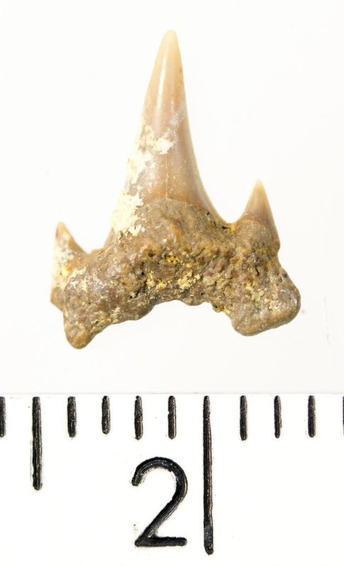 Мелкий боковой зуб с коронкой серого цвета, колюще-режущего типа, S-образно изогнутой, с гладким режущим краем. С лингвальной стороны у основания коронки на эмали имеется скульптура в виде слабой продольной струйчатости. Корень охристый, арочный, умеренно массивный, со следами окатанности. Имеются питательная борозда с лингвальной стороны корня и одна пара добавочных зубцов коронки.