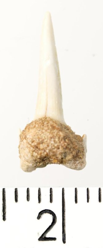 Мелкий боковой зуб с коронкой серого цвета, колюще-режущего типа, S-образно изогнутой, с гладким режущим краем. С лингвальной стороны у основания коронки на эмали имеется скульптура в виде слабой продольной струйчатости. Корень охристый, арочный, умеренно массивный, со следами окатанности. Имеются питательная борозда с лингвальной стороны корня и одна пара добавочных зубцов коронки.