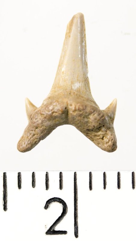 Мелкий боковой зуб с коронкой серого цвета, колюще-режущего типа, S-образно изогнутой, с гладким режущим краем. С лингвальной стороны у основания коронки на эмали имеется скульптура в виде слабой продольной струйчатости. Корень охристый, арочный, умеренно массивный, со следами окатанности. Имеются питательная борозда с лингвальной стороны корня и одна пара добавочных зубцов коронки.