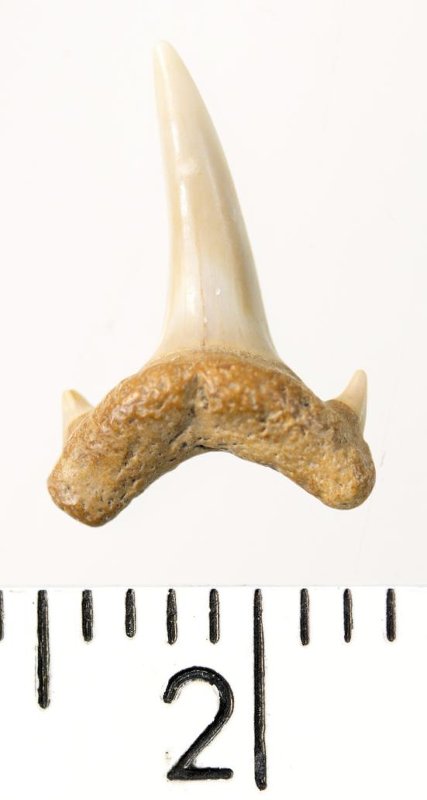 Мелкий боковой зуб с коронкой серого цвета, колюще-режущего типа, S-образно изогнутой, с гладким режущим краем. С лингвальной стороны у основания коронки на эмали имеется скульптура в виде слабой продольной струйчатости. Корень охристый, арочный, умеренно массивный, со следами окатанности. Имеются питательная борозда с лингвальной стороны корня и одна пара добавочных зубцов коронки.