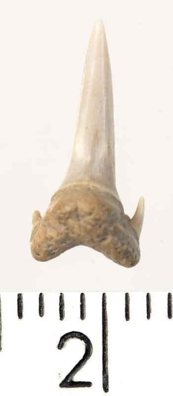 Мелкий боковой зуб с коронкой серого цвета, колюще-режущего типа, S-образно изогнутой, с гладким режущим краем. С лингвальной стороны у основания коронки на эмали имеется скульптура в виде слабой продольной струйчатости. Корень охристый, арочный, умеренно массивный, со следами окатанности. Имеются питательная борозда с лингвальной стороны корня и одна пара добавочных зубцов коронки.