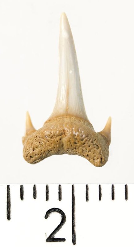 Мелкий боковой зуб с коронкой серого цвета, колюще-режущего типа, S-образно изогнутой, с гладким режущим краем. С лингвальной стороны у основания коронки на эмали имеется скульптура в виде слабой продольной струйчатости. Корень охристый, арочный, умеренно массивный, со следами окатанности. Имеются питательная борозда с лингвальной стороны корня и одна пара добавочных зубцов коронки.