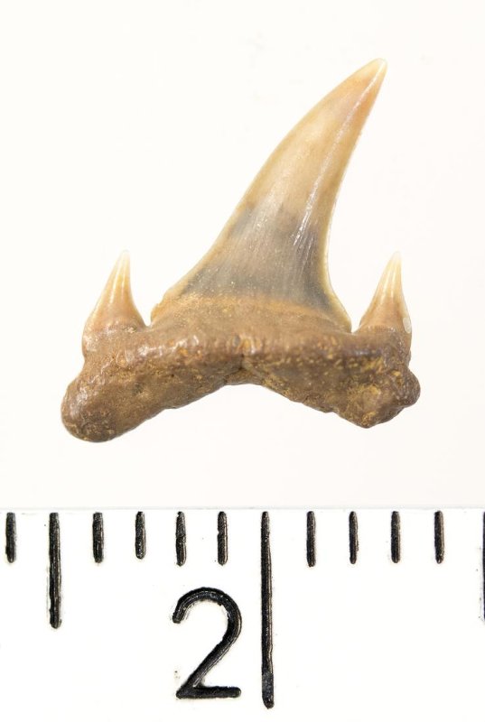 Мелкий боковой зуб с коронкой серого цвета, колюще-режущего типа, S-образно изогнутой, с гладким режущим краем. С лингвальной стороны у основания коронки на эмали имеется скульптура в виде слабой продольной струйчатости. Корень охристый, арочный, умеренно массивный, со следами окатанности. Имеются питательная борозда с лингвальной стороны корня и одна пара добавочных зубцов коронки.
