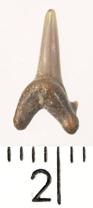 Мелкий боковой зуб с коронкой серого цвета, колюще-режущего типа, S-образно изогнутой, с гладким режущим краем. С лингвальной стороны у основания коронки на эмали имеется скульптура в виде слабой продольной струйчатости. Корень охристый, арочный, умеренно массивный, со следами окатанности. Имеются питательная борозда с лингвальной стороны корня и одна пара добавочных зубцов коронки.