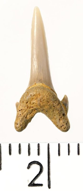 Мелкий боковой зуб с коронкой серого цвета, колюще-режущего типа, S-образно изогнутой, с гладким режущим краем. С лингвальной стороны у основания коронки на эмали имеется скульптура в виде слабой продольной струйчатости. Корень охристый, арочный, умеренно массивный, со следами окатанности. Имеются питательная борозда с лингвальной стороны корня и одна пара добавочных зубцов коронки.