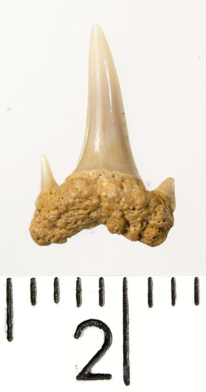 Мелкий боковой зуб с коронкой серого цвета, колюще-режущего типа, S-образно изогнутой, с гладким режущим краем. С лингвальной стороны у основания коронки на эмали имеется скульптура в виде слабой продольной струйчатости. Корень охристый, арочный, умеренно массивный, со следами окатанности. Имеются питательная борозда с лингвальной стороны корня и одна пара добавочных зубцов коронки.