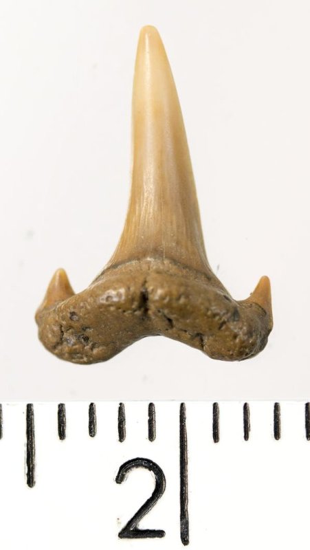 Мелкий боковой зуб с коронкой серого цвета, колюще-режущего типа, S-образно изогнутой, с гладким режущим краем. С лингвальной стороны у основания коронки на эмали имеется скульптура в виде слабой продольной струйчатости. Корень охристый, арочный, умеренно массивный, со следами окатанности. Имеются питательная борозда с лингвальной стороны корня и одна пара добавочных зубцов коронки.