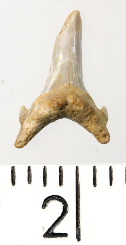Мелкий боковой зуб с коронкой серого цвета, колюще-режущего типа, S-образно изогнутой, с гладким режущим краем. С лингвальной стороны у основания коронки на эмали имеется скульптура в виде слабой продольной струйчатости. Корень охристый, арочный, умеренно массивный, со следами окатанности. Имеются питательная борозда с лингвальной стороны корня и одна пара добавочных зубцов коронки.
