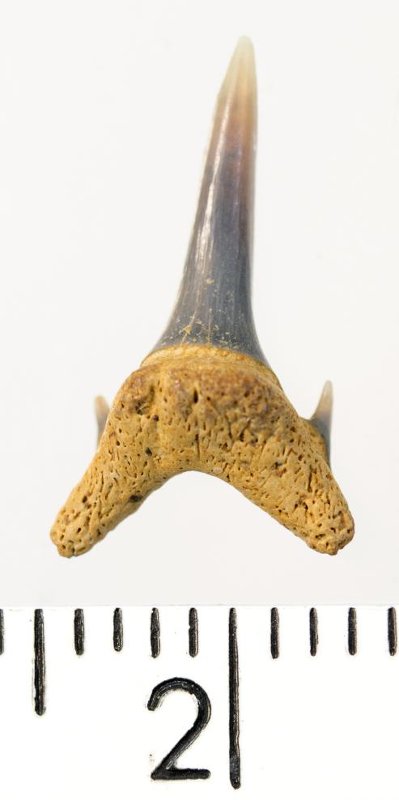 Мелкий боковой зуб с коронкой серого цвета, колюще-режущего типа, S-образно изогнутой, с гладким режущим краем. С лингвальной стороны у основания коронки на эмали имеется скульптура в виде слабой продольной струйчатости. Корень охристый, арочный, умеренно массивный, со следами окатанности. Имеются питательная борозда с лингвальной стороны корня и одна пара добавочных зубцов коронки.