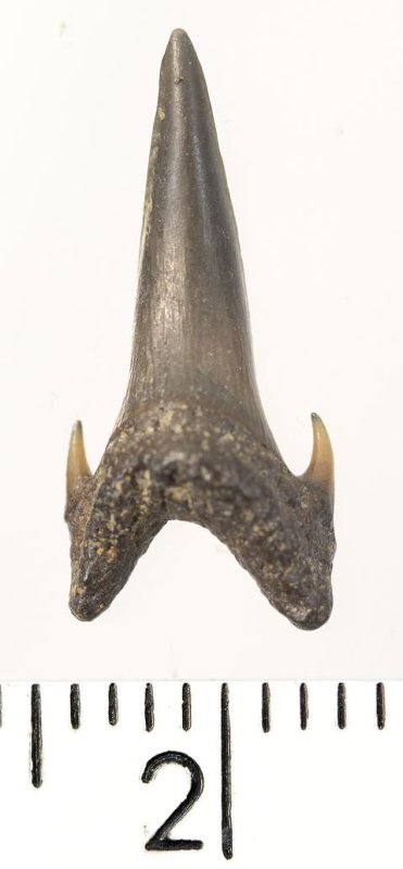 Мелкий боковой зуб с коронкой серого цвета, колюще-режущего типа, S-образно изогнутой, с гладким режущим краем. С лингвальной стороны у основания коронки на эмали имеется скульптура в виде слабой продольной струйчатости. Корень охристый, арочный, умеренно массивный, со следами окатанности. Имеются питательная борозда с лингвальной стороны корня и одна пара добавочных зубцов коронки.